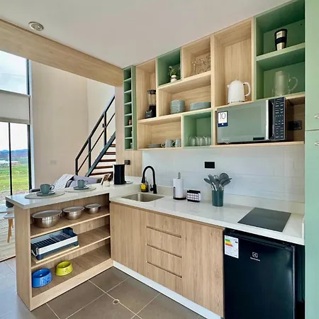 In a kitchen at Tiny House Con Jacuzzi, Fogata Y Starlink Villa, there are kitchenware.
